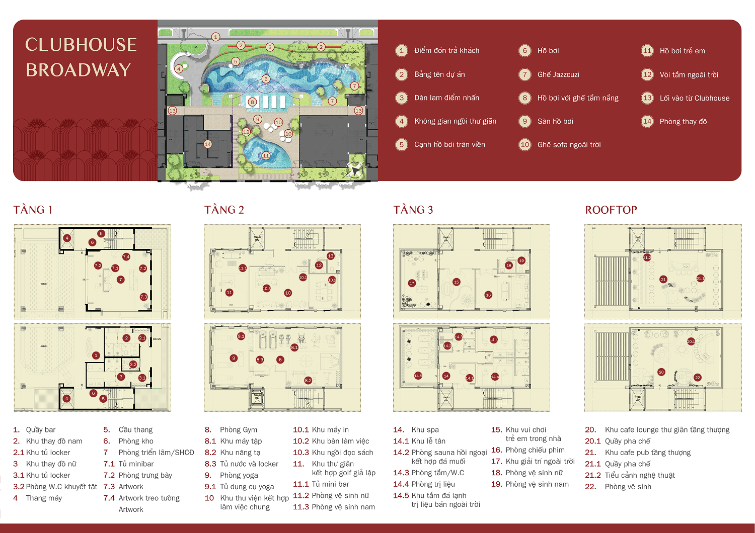 Clubhouse Broadway – Khu Quảng trường đón tiếp – Khu Thể thao (đa năng, dưỡng chất, bơi) – Khu Thể dục cộng đồng – Khu Hồ cảnh quan & nhạc nước – Khu Công viên thư giãn – Vườn trị liệu giác quan – Khu Gia đình – Khu Vui chơi trẻ em